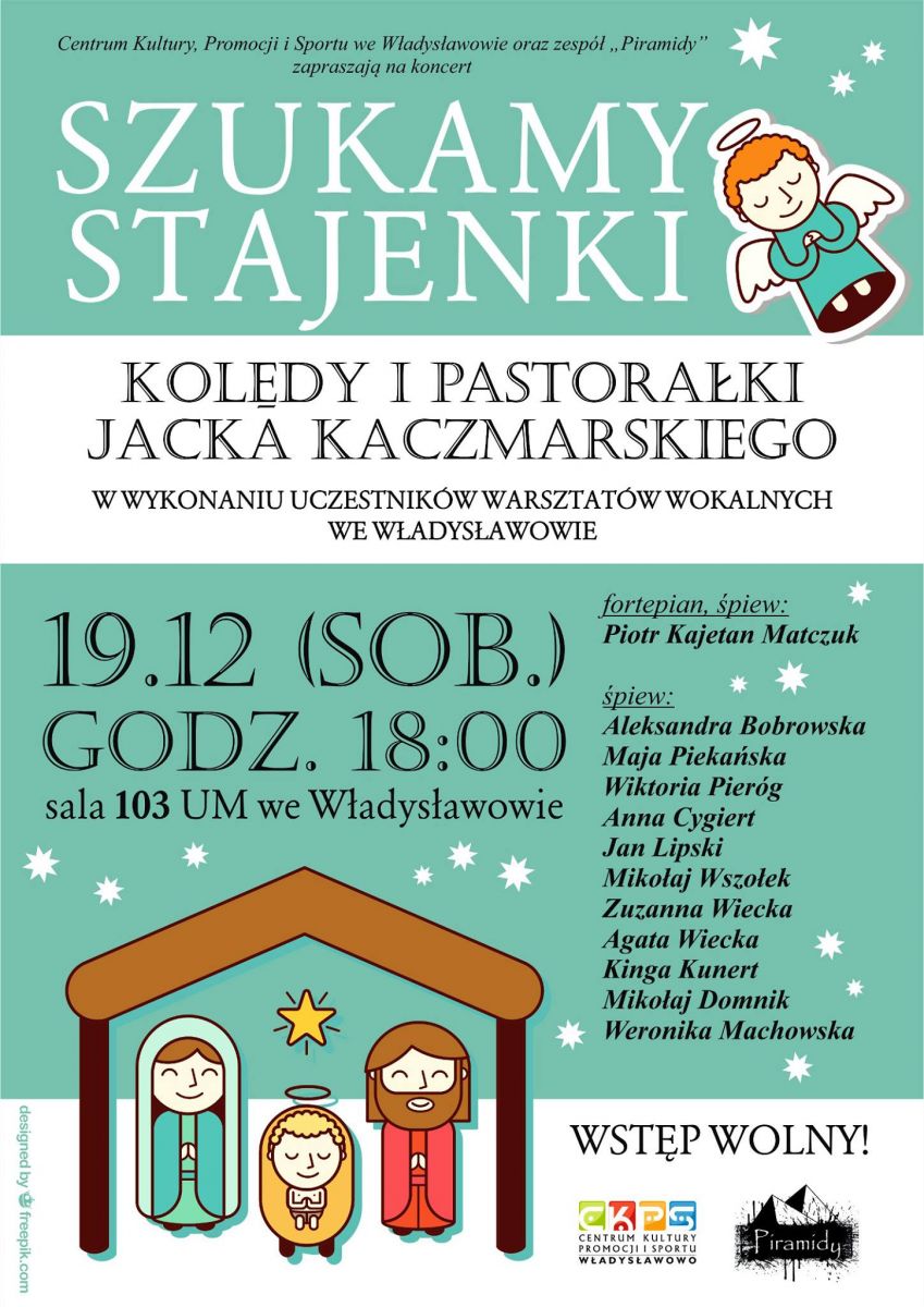 Centrum Kultury, Promocji i Sportu zaprasza na koncert kolęd i pastorałek Jacka Kaczmarskiego w wykonaniu dzieci i młodzieży – uczestników warsztatów wokalnych we Władysławowie. Koncert odbędzie się 19 grudnia godz. 18.00 w Sali 103 Urzędu Miejskiego we Władysławowie.